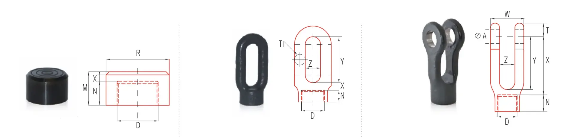 - Flat thrust head, pull ring, or female clevis, removable